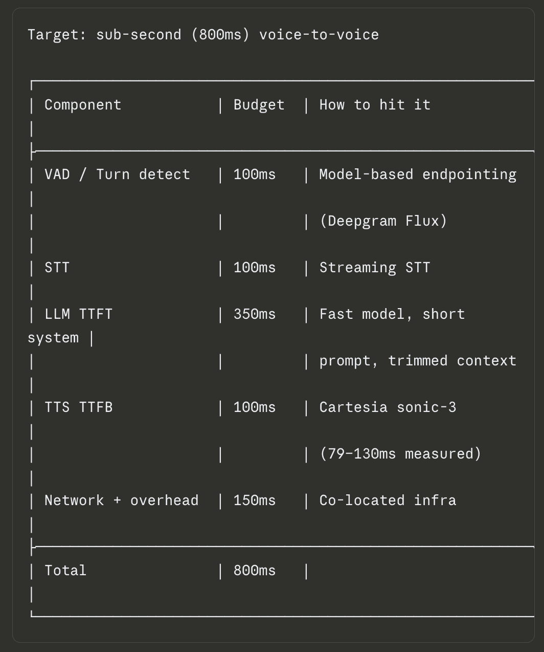 Here's how we approach it: set a total end-to-end latency budget for voice-to-voice responses and allocate it across the voice agent pipeline.