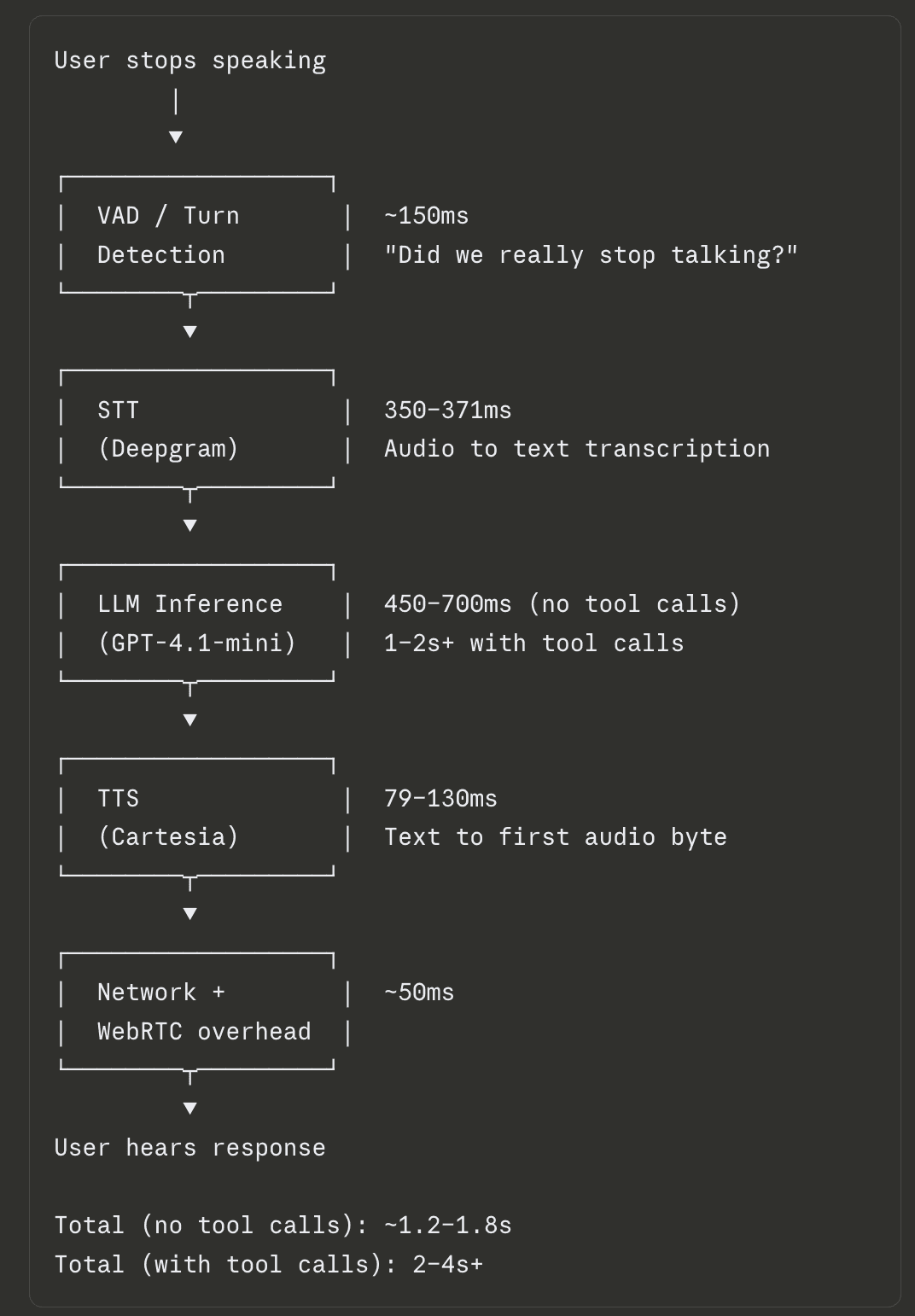The LLM alone is 450-700ms on simple turns, and that's with a fast model (GPT-4.1-mini).
